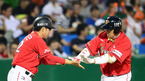 [OSEN=대전, 민경훈 기자] 19일 오후 대전 한밭야구장에서 열린 '2012 팔도 프로야구' 한화 이글스와 SK 와이번스의 경기에서 8회초 1사 주자 1,2루 SK 조인성이 좌월 스리런 홈런을 날린 후 덕아웃에서 이호준과 기쁨을 나누고 있다.