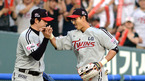 [OSEN=잠실, 곽영래 기자] 19일 오후 서울 잠실야구장에서 열린 '2012 팔도 프로야구' 두산 베어스와 LG 트윈스의 경기 6회말 2사 2루 두산 최준석의 타구를 LG 박용택이 호수비로 이닝을 마무리하고 김기표와 하이파이브를 하고 있다