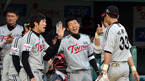 [OSEN=대전, 민경훈 기자] 19일 오후 대전 한밭야구장에서 열린 '2012 팔도 프로야구' 한화 이글스와 SK 와이번스의 경기에서 6회초를 마친 후 한화 선발 류현진이 한숨을 쉬며 덕아웃으로 향하고 있다. 한화 '괴물 에이스' 류현진(25