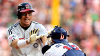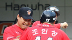 [OSEN=대전, 민경훈 기자] 19일 오후 대전 한밭야구장에서 열린 '2012 팔도 프로야구' 한화 이글스와 SK 와이번스의 경기에서 6회초 2사 주자 없는 상황에서 SK 조인성이 좌월 솔로 홈런을 날린 후 덕아웃에서 이만수 감독과 하이파이