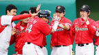 [OSEN=대전, 민경훈 기자] 19일 오후 대전 한밭야구장에서 열린 '2012 팔도 프로야구' 한화 이글스와 SK 와이번스의 경기에서 6회초 2사 주자 없는 상황에서 SK 조인성이 좌월 솔로 홈런을 날린 후 덕아웃에서 동료들과 기쁨을 나누고