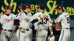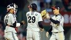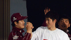 [OSEN=목동, 김영민 기자] 19일 오후 서울 목동구장에서 열린 2012 팔도 프로야구 넥센 히어로즈와 삼성 라이온즈의 경기 9회초 넥센이 10-3 리드하고 있는 가운데 마지막 수비를 앞두고 김병현이 선발 강윤구와 하이파이브를 하고