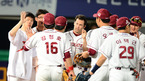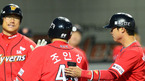 [OSEN=대전, 민경훈 기자] 19일 오후 대전 한밭야구장에서 열린 '2012 팔도 프로야구' 한화 이글스와 SK 와이번스의 경기에서 8회초 1사 주자 1,2루 SK 조인성이 좌월 스리런 홈런을 날린 후 홈에서 박정권 박재상과 기쁨을 나누고 있