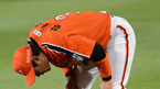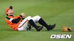 [OSEN=광주, 이대선 기자] 22일 오후 광주 무등야구장에서 열린 '2012 팔도 프로야구' KIA 타이거즈와 한화 이글스의 경기, 5회말 무사 KIA 나지완의 타구를 잡다 넘어진 한화 한상훈이 고통스러워하고 있다. 각각 선두 SK와 6.5경기, 8