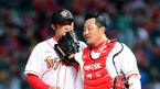 [OSEN=인천 ,백승철 기자] 22일 오후 인천 문학구장에서 열린 '2012 팔도 프로야구' SK 와이번스와 두산 베어스의 경기 6회초 교체된 임경완이 마운드에서 조인성과 이야기를 하고 있다. 두산은 시즌 2승과 팀의 5연패 탈출을 위해 김