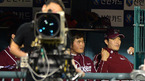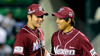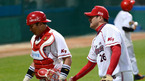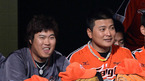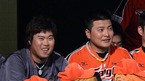 [OSEN=광주, 이대선 기자] 22일 오후 광주 무등야구장에서 열린 '2012 팔도 프로야구' KIA 타이거즈와 한화 이글스의 경기, 5회초 2사 한화 양성우 타석때 류현진과 김태균이 더그아웃에서 미소를 지으며 경기를 바라보고 있다. 각각