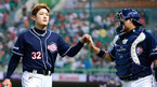 [OSEN=인천 ,백승철 기자] 22일 오후 인천 문학구장에서 열린 '2012 팔도 프로야구' SK 와이번스와 두산 베어스의 경기 4회말을 마치고 김선우가 덕아웃으로 향하면서 양의지와 하이파이브를 하고 있다. 두산은 시즌 2승과 팀의 5연