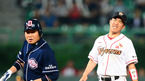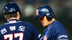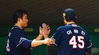 [OSEN=인천, 민경훈 기자] 23일 오후 인천 문학구장에서 열린 '2012 팔도 프로야구' SK 와이번스와 두산 베어스의 경기에서 6회초 무사 주자 1루 두산 김동주가 우익수 오른쪽 1루타를 날린 후 1루에서 전형도 코치와 하이파이브를 하