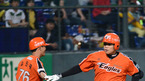 [OSEN=광주, 이대선 기자] 24일 오후 광주 무등야구장에서 열린 '2012 팔도 프로야구' KIA 타이거즈와 한화 이글스의 경기, 6초 2사 1루 한화 최진행이 우월 투런 홈런을 치고 김민재 코치와 하이파이브를 하고 있다. 3연전 마지막 경
