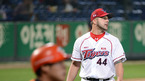 [OSEN=광주, 이대선 기자] 24일 오후 광주 무등야구장에서 열린 '2012 팔도 프로야구' KIA 타이거즈와 한화 이글스의 경기, 6초 2사 1루 KIA 앤서니가 한화 최진행에게 우월 투런 홈런을 허용하고 허탈한 미소를 짓고 있다. 3연전 마지