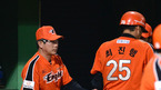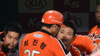[OSEN=광주, 이대선 기자] 24일 오후 광주 무등야구장에서 열린 '2012 팔도 프로야구' KIA 타이거즈와 한화 이글스의 경기, 5회초 무사 한화 최진행이 좌월 솔로 홈런을 치고 더그아웃에서 한대화 감독의 축하를 받고 있다. 3연전 마