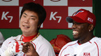 [OSEN=광주, 이대선 기자] 24일 오후 광주 무등야구장에서 열린 '2012 팔도 프로야구' KIA 타이거즈와 한화 이글스의 경기에 앞서 KIA 새로운 외국인 투수 헨리 소사(27)가 나지완과 이야기를 나누고 있다. 3연전 마지막 경기, 한화 6년