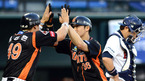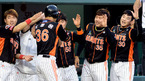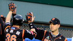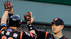 [OSEN=목동,지형준 기자] 25일 오후 서울 목동구장에서 열린 '2012 팔도 프로야구' 넥센 히어로즈와 한화 이글스의 경기, 6회말 1사 2루에서 넥센 박병호가 역전 적시 2루타를 날리고 심재학 코치와 하이파이브를 하고 있다. 이날 넥