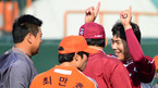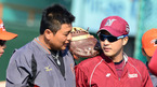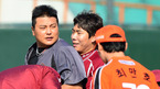 [OSEN=목동,지형준 기자] 25일 오후 서울 목동구장에서 열린 '2012 팔도 프로야구' 넥센 히어로즈와 한화 이글스의 경기, 경기전 한화 김태균과 넥센 강정호가 장난을 치고 있다. 이날 넥센은 '핵잠수함' 김병현(33)을, 한화는 '괴물