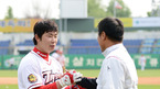 [OSEN=광주, 이대선 기자] 25일 오후 광주 무등야구장에서 열린 '2012 팔도 프로야구' KIA 타이거즈와 LG 트윈스의 경기에 앞서 KIA 나지완이 LG 최태원 코치와 인사를 나누고 있다. KIA가 4연승을 거둘 것인가, LG의 연승인가. KIA 선발 김