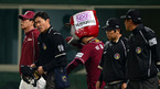 [OSEN=목동,지형준 기자] 25일 오후 서울 목동구장에서 열린 '2012 팔도 프로야구' 넥센 히어로즈와 한화 이글스의 경기, 9회말 2사 2루에서 넥센 유한준이 스트라이크낫아웃에 최규순 구심이 투구에 맞아 괴로워하고 있다. 이날 넥