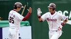 [OSEN=목동, 곽영래 기자] 26일 서울 목동구장에서 열린 '2012 팔도 프로야구' 넥센 히어로즈와 한화 이글스의 경기 2회말 1사 넥센 강정호가 솔로 홈런을 치고 덕아웃에 들어와 박병호와 하이파이브를 하고 있다. 양팀은 26일 선발
