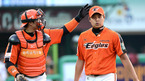[OSEN=목동, 곽영래 기자] 26일 서울 목동구장에서 열린 '2012 팔도 프로야구' 넥센 히어로즈와 한화 이글스의 경기 5회말 2사 만루 한화 정범모가 이닝을 무실점으로 막은 유창식을 격려하고 있다. 양팀은 26일 선발로 앤디 밴 헤켄(