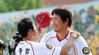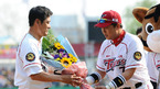 [OSEN=광주, 이대선 기자] 26일 오후 광주 무등야구장에서 열린 '2012 팔도 프로야구' KIA 타이거즈와 LG 트윈스의 경기에 앞서 이종범이 KIA 김상훈에게 꽃다발을 받고 있다. 1993시즌 KIA전신 해태 소속으로 프로에 데뷔한 이종범은 16