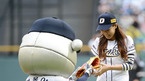 [OSEN=잠실, 이대선 기자] 27일 오후 잠실야구장에서 열린 '2012 팔도 프로야구' 두산 베어스와 롯데 자이언츠의 경기에 앞서 원더걸스 유빈이 시구를 위해 두산 마스코트 철웅이에게 글러브를 받고 있다. 두산 베어스의 '써니' 김