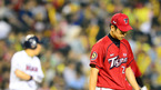 [OSEN=잠실, 민경훈 기자] 29일 오후 서울 잠실구장에서 열린 두산 베어스와 KIA 타이거즈의 경기에서 4회말 무사 주자 3루 두산 김동주가 중견수 앞 역전 1타점 적시타를 날리자 KIA 선발 윤석민이 아쉬워하고 있다. KIA 선발로 나서