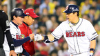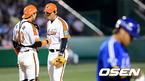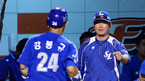 [OSEN=대전 ,백승철 기자] 29일 오후 대전 한밭구장에서 열린 '2012 팔도 프로야구' 한화 이글스와 삼성 라이온즈의 경기 5회초 무사 2,3루 조동찬의 1타점 적시타에 홈을 밟은 가옹규가 덕아웃으로 향하면서 류중일 감독과 하이파