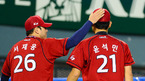 [OSEN=잠실, 민경훈 기자] 29일 오후 서울 잠실구장에서 열린 두산 베어스와 KIA 타이거즈의 경기에서 4회에 2실점 한 후 4회를 마치고 덕아웃으로 향하는 윤석민을 서재응이 격려하고 있다. KIA 선발로 나서는 윤석민은 시즌 8경기 2
