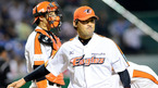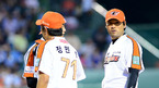 [OSEN=대전 ,백승철 기자] 29일 오후 대전 한밭구장에서 열린 '2012 팔도 프로야구' 한화 이글스와 삼성 라이온즈의 경기 4회초 2사 만루 이승엽이 2타점 적시타를 치고 1루에서 김태균 코치와 이야기를 하며 미소를 짓고 있다. 3연전