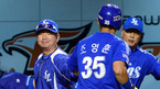 [OSEN=대전 ,백승철 기자] 29일 오후 대전 한밭구장에서 열린 '2012 팔도 프로야구' 한화 이글스와 삼성 라이온즈의 경기 4회초 2사 2루 박한이의 좌익수앞 1루타에 홈을 밟은 2루주자 조영훈이 덕아웃에서 류중일 감독과 하이파이