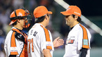 [OSEN=대전 ,백승철 기자] 29일 오후 대전 한밭구장에서 열린 '2012 팔도 프로야구' 한화 이글스와 삼성 라이온즈의 경기 4회초 무사 1,3루, 박찬호가 마운드에서 정민철 코치와 이야기를 나누고 있다. 3연전 첫 날부터 한화는 '코리