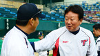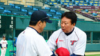 [OSEN=잠실, 민경훈 기자] 29일 오후 서울 잠실구장에서 두산 베어스와 KIA 타이거즈의 경기가 열릴 예정인 가운데 양 팀 훈련시간에 두산 김진욱 감독과 KIA 선동열 감독이 악수를 나눈 후 즐겁게 얘기를 나누고 있다. KIA 선발로 나