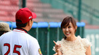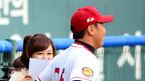 [OSEN=잠실, 민경훈 기자] 29일 오후 서울 잠실구장에서 두산 베어스와 KIA 타이거즈의 경기가 열릴 예정인 가운데 양 팀 훈련시간에 김민아 아나운서가 KIA 이범호와 즐겁게 얘기를 나누고 있다. KIA 선발로 나서는 윤석민은 시즌 8