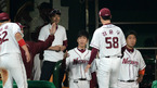 [OSEN=목동, 이대선 기자] 30일 오후 서울 목동야구장에서 열린 '2012 팔도 프로야구' 넥센 히어로즈와 SK 와이번스의 경기, 5회초 2사 SK 정근우를 외야플라이로 처리한 넥센 강윤구가 더그아웃으로 가며 동료들의 축하를 받고 있다.