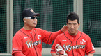 [OSEN=목동, 이대선 기자] 30일 오후 서울 목동야구장에서 열린 '2012 팔도 프로야구' 넥센 히어로즈와 SK 와이번스의 경기에 앞서 SK 이만수 감독이 그라운드에 나온 정근우를 격려하고 있다. 정근우는 29일 경기서 넥센 투수 나이트