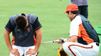 [OSEN=대전, 민경훈 기자] 30일 오후 대전 한밭야구장에서 한화 이글스와 삼성 라이온즈의 경기가 열릴 예정인 가운데 양 팀 훈련시간에 한화 한용덕 코치가 무릎을 꿇은 최진행에게 배트로 장난을 치고 있다. 선발로 나서는 삼성