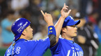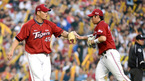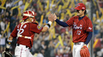 [OSEN=대전 ,백승철 기자] 31일 오후 대전 한밭구장에서 열린 '2012 팔도 프로야구' 한화 이글스와 삼성 라이온즈의 경기 종료후 진갑용과 오승환이 승리를 기뻐하며 세리머니를 하고 있다. 대한민국 최고 에이스가 국민타자를 압