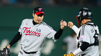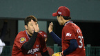 [OSEN=잠실, 이대선 기자] 31일 오후 서울 잠실야구장에서 열린 '2012 팔도 프로야구' 두산 베어스와 KIA 타이거즈의 경기, 9회초 2사두산 최준석 타석때 KIA 박지훈이 마운드를 내려가며 서재응과 하이파이브를 하고 있다. 허리 통증