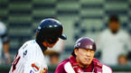 [OSEN=부산, 민경훈 기자] 1일 오후 사직구장에서 열린 '2012 팔도 프로야구' 롯데 자이언츠와 넥센 히어로즈의 경기에서 2회말 1사 만루에서 넥센 지재옥 포수가 롯데 김주찬의 3루땅볼때 홈으로 파고드는 3루주자 김문호를 태그아