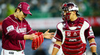 [OSEN=부산, 민경훈 기자] 1일 오후 사직구장에서 열린 '2012 팔도 프로야구' 롯데 자이언츠와 넥센 히어로즈의 경기에서 3회말 2사 주자 만루위기를 넘긴 넥센 선발 김병현이 지재옥 포수와 얘기를 나누며 덕아웃으로 향하고 있다.