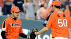 [OSEN=잠실, 곽영래 기자] 2일 오후 서울 잠실구장에서 열린 '2012 팔도 프로야구' LG 트윈스와 한화 이글스의 경기, 7회말 1사 한화 양훈이 강판되면서 다음투수 안승민과 하이파이브를 하고 있다. LG는 2일 잠실구장에서 열리는 ‘2