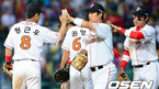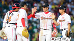 [OSEN=인천 ,백승철 기자] 2일 오후 인천 문학구장에서 열린 '2012 팔도 프로야구' SK 와이번스와 KIA 타이거즈의 경기 종료후 선수들이 승리를 기뻐하며 하이파이브를 하고 있다. SK는 이날 열린 KIA와의 홈경기에서 선발 김광현의
