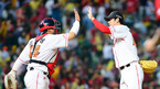 [OSEN=인천 ,백승철 기자] 2일 오후 인천 문학구장에서 열린 '2012 팔도 프로야구' SK 와이번스와 KIA 타이거즈의 경기 종료후 조인성과 박희수가 승리를 기뻐하며 하이파이브를 하고 있다. SK는 이날 열린 KIA와의 홈경기에서 선발