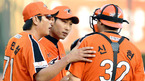 [OSEN=인천 ,백승철 기자] 2일 오후 인천 문학구장에서 열린 '2012 팔도 프로야구' SK 와이번스와 KIA 타이거즈의 경기 5회말 1사 1,2루 송산이 마운드에 올라와 윤석민을 격려하고 있다. SK는 윤희상을 선발로 내세웠다. 올 시즌 9경기