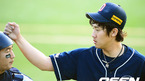 [OSEN=대구, 민경훈 기자] 3일 오후 대구 시민구장에서 열린 '2012 팔도 프로야구' 삼성 라이온즈와 두산 베어스의 경기 2회말을 마치고 두산 선발 이용찬이 덕아웃으로 들어가며 최재훈 포수의 머리를 때리고 있다. 이 날 경기에서