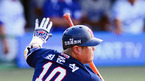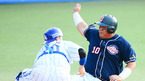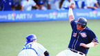[OSEN=대구, 민경훈 기자] 3일 오후 대구 시민구장에서 열린 '2012 팔도 프로야구' 삼성 라이온즈와 두산 베어스의 경기 2회초 2사 주자 1,3루 두산 최재훈의 좌익수 플라이 아웃 타구때 3루 주자 최준석이 홈으로 쇄도, 진갑용에게