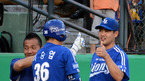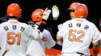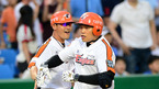 [OSEN=대전,지형준 기자] 5일 오후 대전구장에서 열린 '2012 팔도 프로야구' 한화 이글스와 롯데 자이언츠의 경기, 3회말 2사1,3루에서 한화 최진행이 스리런 홈런을 날리고 김민재 코치와 하이파이브를 하며 홈으로 향하고 있다.