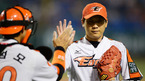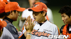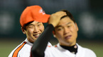 [OSEN=대전,지형준 기자] 5일 오후 대전구장에서 열린 '2012 팔도 프로야구' 한화 이글스와 롯데 자이언츠의 경기, 8회초 수비를 마친 한화 선발투수 김혁민이 더그아웃에서 정범모와 하이파이브를 하고 있다. 이날 한화는 6년차 우