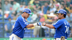 [OSEN=광주, 이대선 기자] 6일 오후 광주 무등야구장에서 열린 '2012 팔도 프로야구' KIA 타이거즈와 삼성 라이온즈의 경기, 1회초 2사 1,2루 삼성 강봉규가 1타점 중전 적시타를 치고 김태균 코치와 하이파이브를 하고 있다. KIA 타이