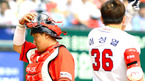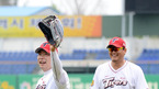 [OSEN=대전,지형준 기자] 현충일인 6일 오후 대전구장에서 열린 '2012 팔도 프로야구' 한화 이글스와 롯데 자이언츠의 경기, 경기전 롯데 강민호가 한화 김태균에 방망이를 던지며 장난을 치고 있다. 이날 한화는 송창식(27)을, 롯
