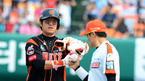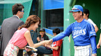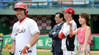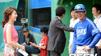 [OSEN=광주, 이대선 기자] 6일 오후 광주 무등야구장에서 열린 '2012 팔도 프로야구' KIA 타이거즈와 삼성 라이온즈의 경기에 앞서 정지원 KBS 아나운서가 KIA 이범호에게 응원의 메시지를 보내고 있다. KIA 타이거즈 외국인 투수 헨리